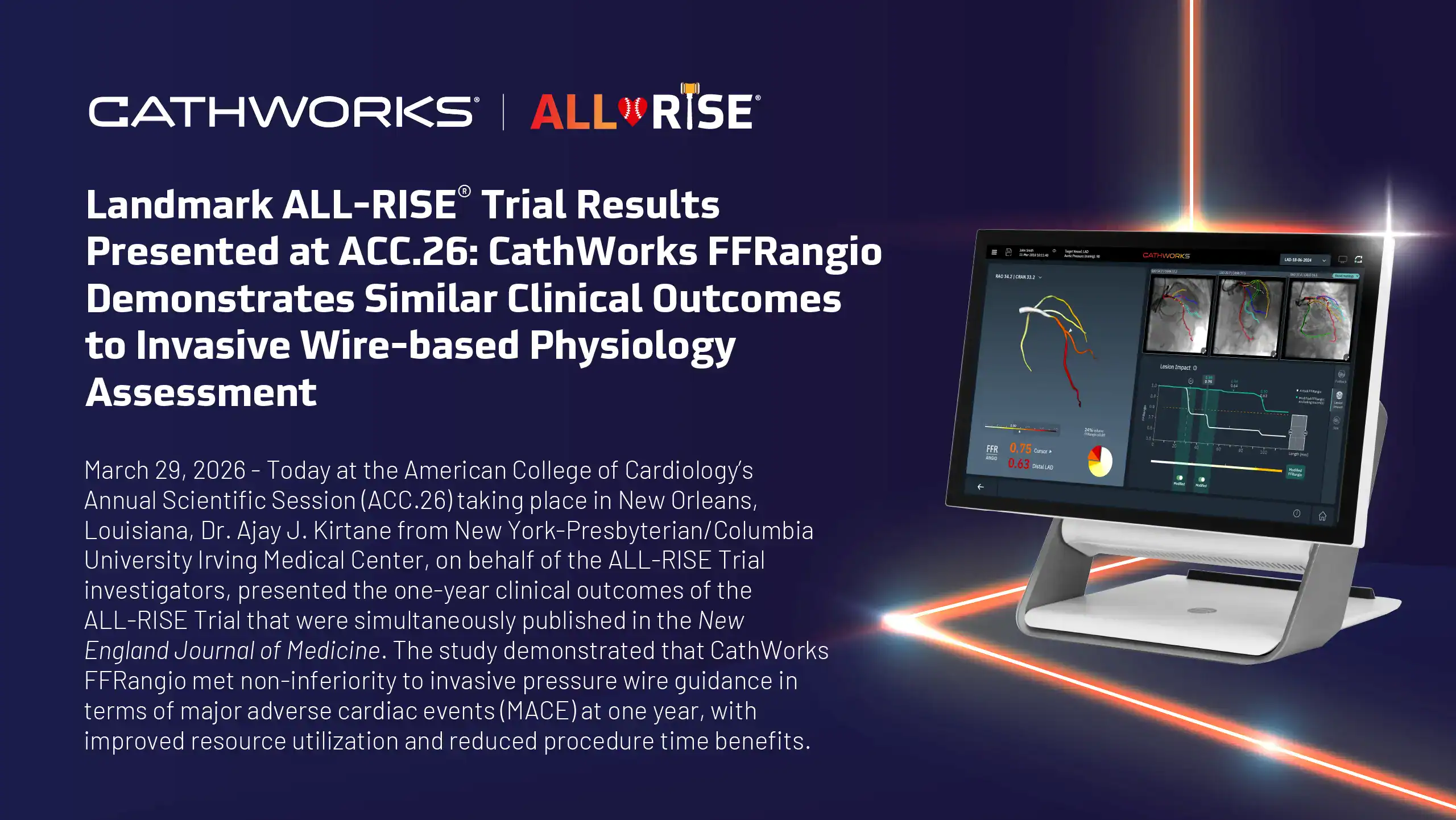 New Orleans (March 29, 2026) – Today at the American College of Cardiology’s Annual Scientific Session (ACC.26) taking place in New Orleans, Louisiana, Dr. Ajay J. Kirtane from New York-Presbyterian/Columbia University Irving Medical Center, on behalf of the ALL-RISE Trial investigators, presented the one-year clinical outcomes of the ALL-RISE Trial that were simultaneously published in the New England Journal of Medicine. The study demonstrated that CathWorks FFRangio met non-inferiority to invasive pressure wire guidance in terms of major adverse cardiac events (MACE) at one year, with improved resource utilization and reduced procedure time benefits.